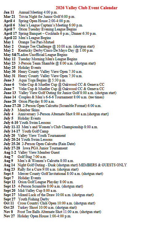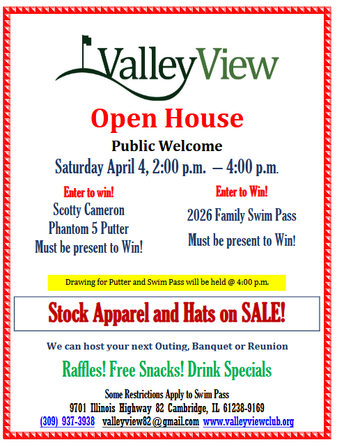 We strive to ensure that all of our information is correct and up-to-date. All golf outings and special events will be posted in the clubhouse, on the website, and on Facebook. To confirm dates and times, please contact us at 309-937-3938. Sign-up deadlines for tournaments are at 5 pm of the posted deadline date. Sometimes events will be canceled and will not be rescheduled. If this happens, all fees, less any club expenses, WILL BE REFUNDED. Please sign up early, and enjoy your club. We enjoy your participation!
